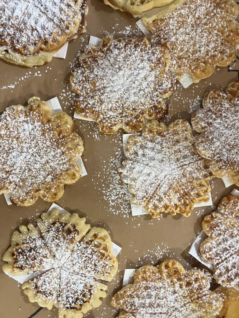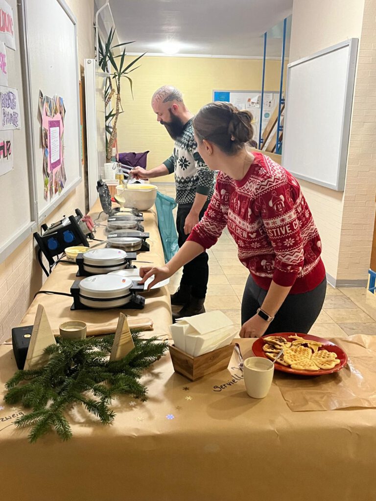 Teigspenden vom Kollegium, von der Schulelternsprecherin und von Marion Forster. Waffelzubereitung von Familie Feodorov und Marion Forster – weihnachtlich, duftend, lecker.